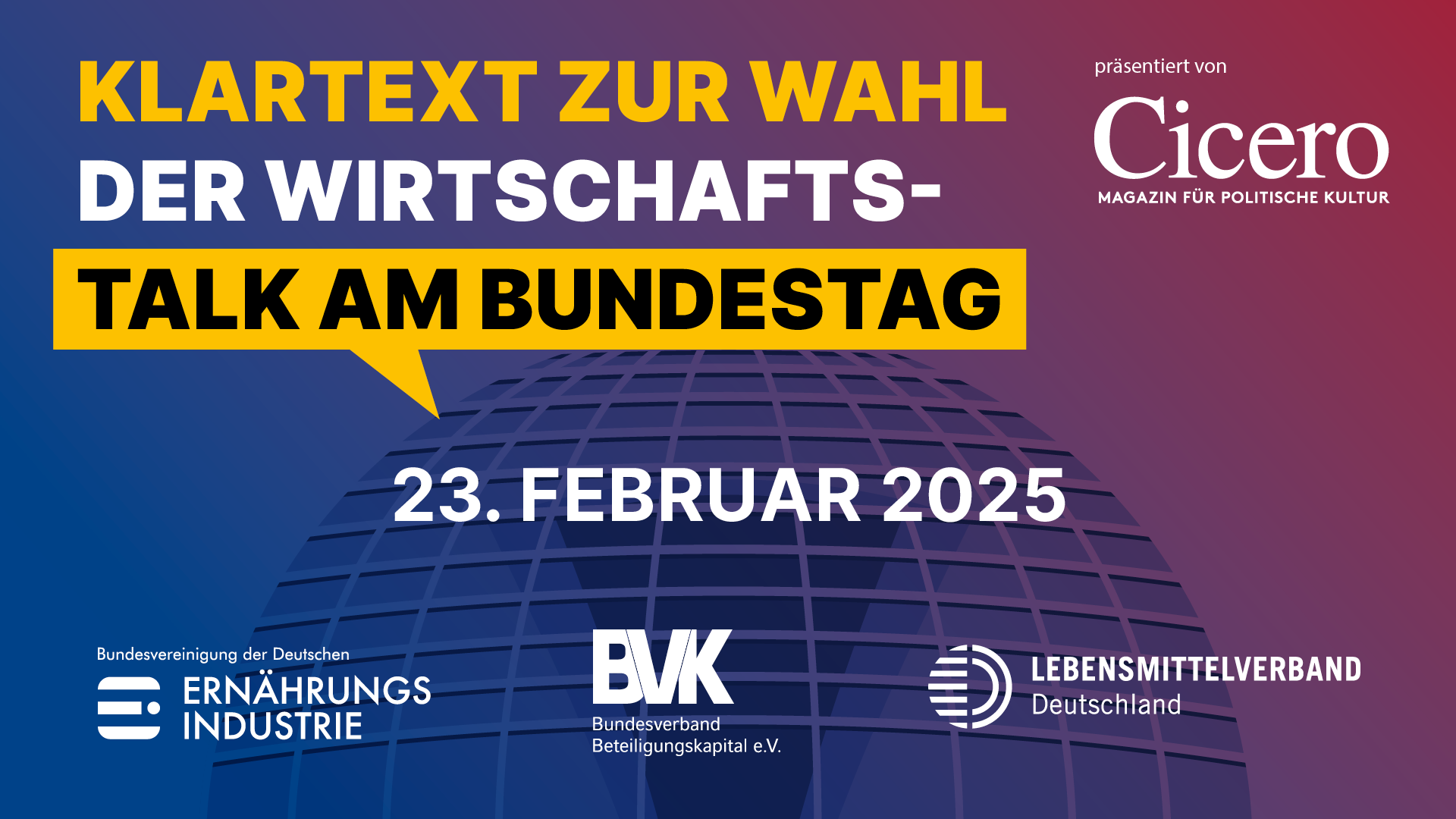 Der Bundesverband Beteiligungskapital (BVK), die Bundesvereinigung der Deutschen Ernährungsindustrie (BVE) und der Lebensmittelverband Deutschland laden ein zu einem exklusiven Wahltalk – live vor Ort im Hopfingerbräu am Brandenburger Tor und per Livestream!